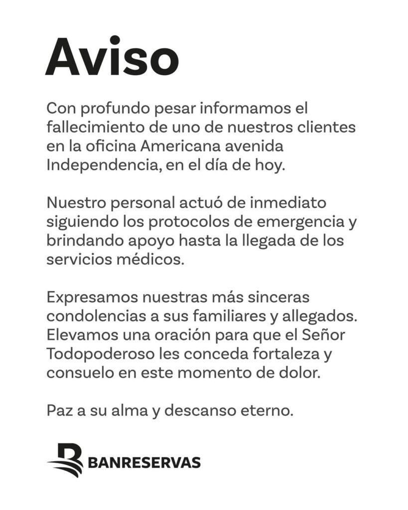 Banreservas expresó solidaridad a los parientes y allegados, remarcando mensajes de apoyo y ofreciendo oraciones públicas por consuelo ante la situación presentada en la sucursal.